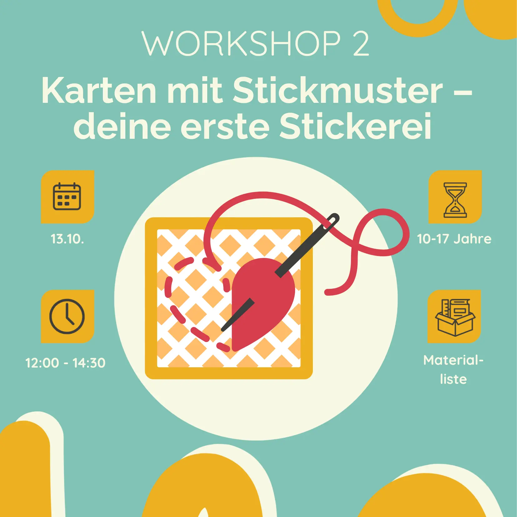Mit Nadel und Faden zauberst du bunte Muster auf Pappe und verwandelst sie in einzigartige Karten. Jede Karte ist ein kleines Kunstwerk, das du verschenken oder selbst behalten kannst. Du lernst Schritt für Schritt, wie Stickerei funktioniert. Mit jedem Stich wächst dein eigenes Design. Am Ende hast du etwas Persönliches geschaffen, das es nur einmal gibt.